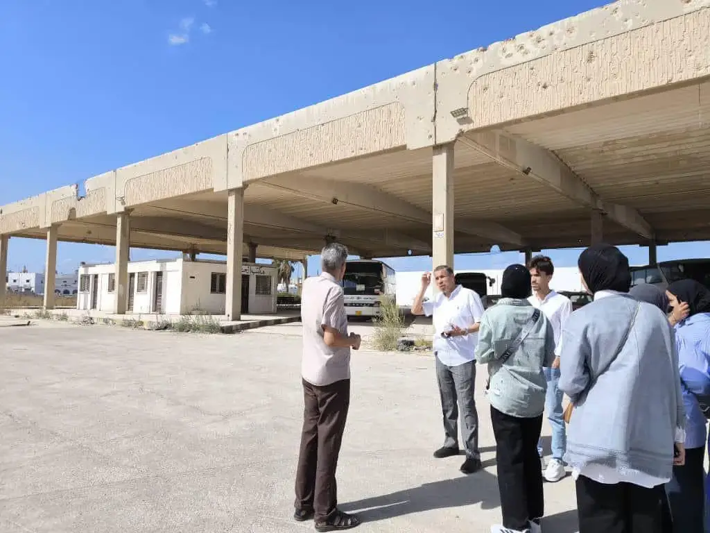 The visit included two locations: a bus station near Algeria Street by the former Al-Jumhuriyah Hospital, and the intercity bus station on Alexandria Street near the Municipal Hotel. This hands-on field trip aimed to train students and assess the reality of current conditions as part of their studies in planning and designing the Benghazi Bus Station